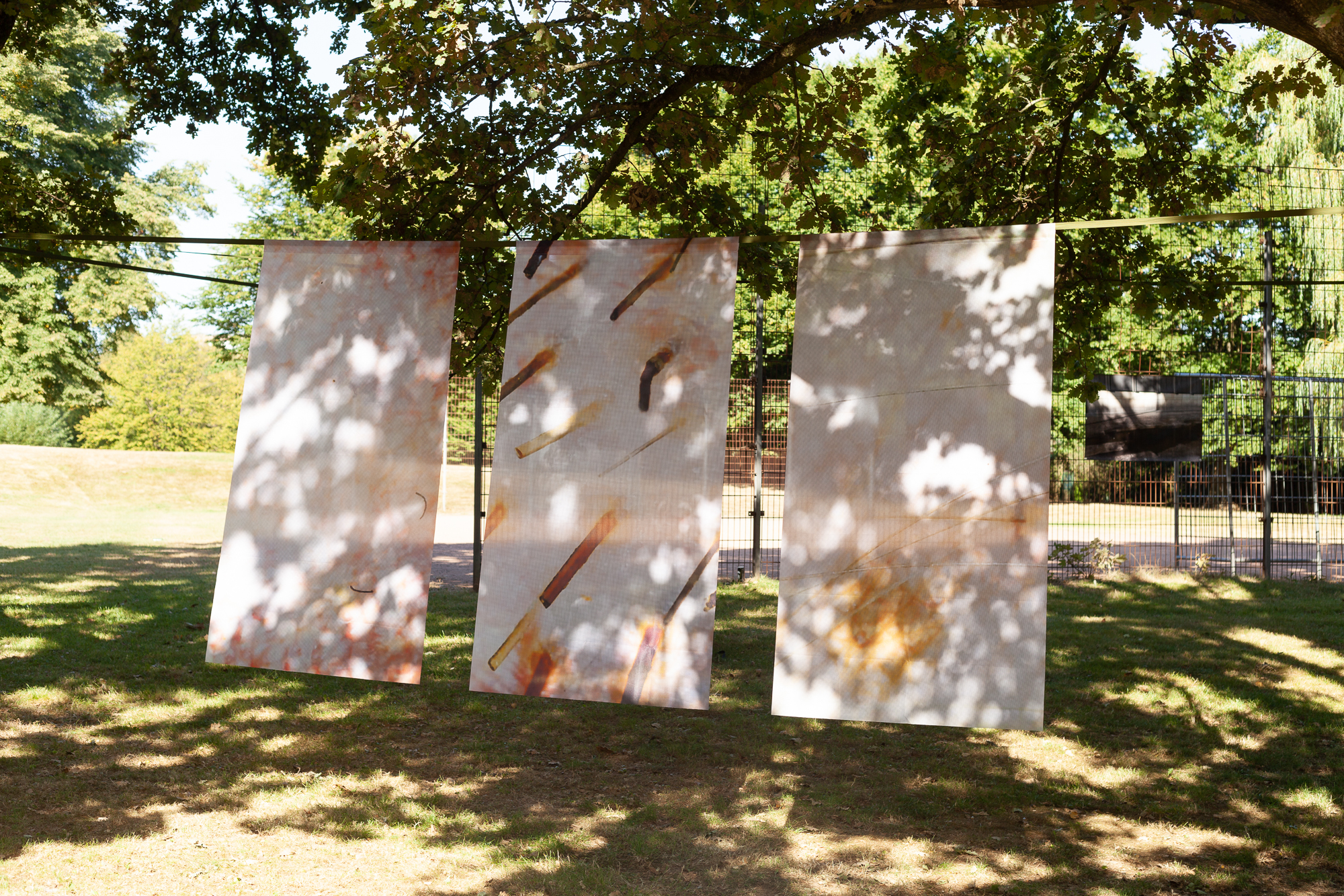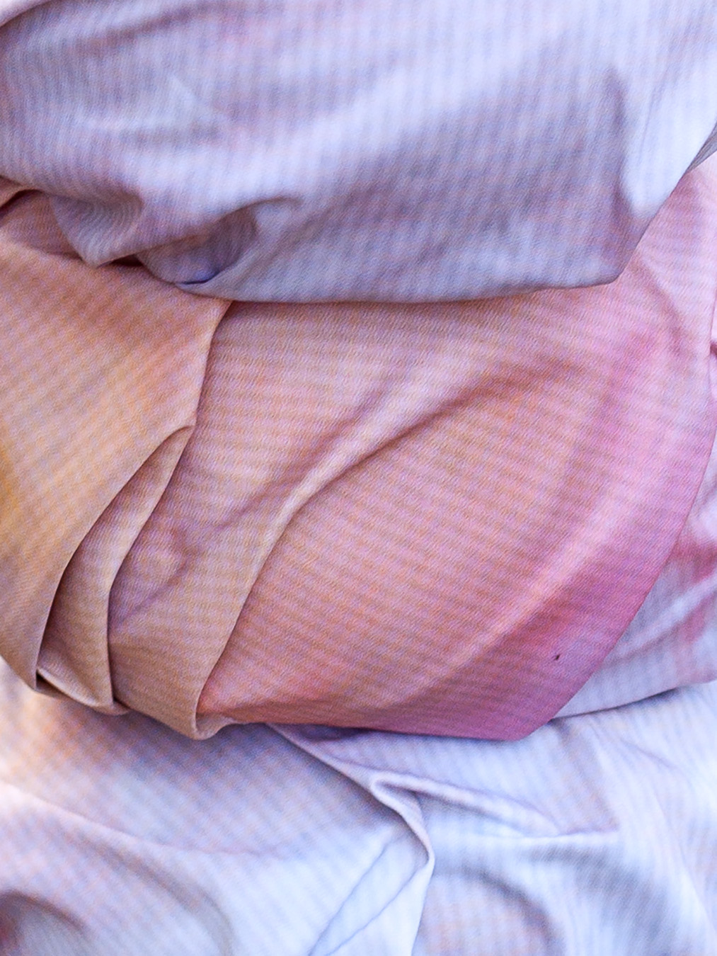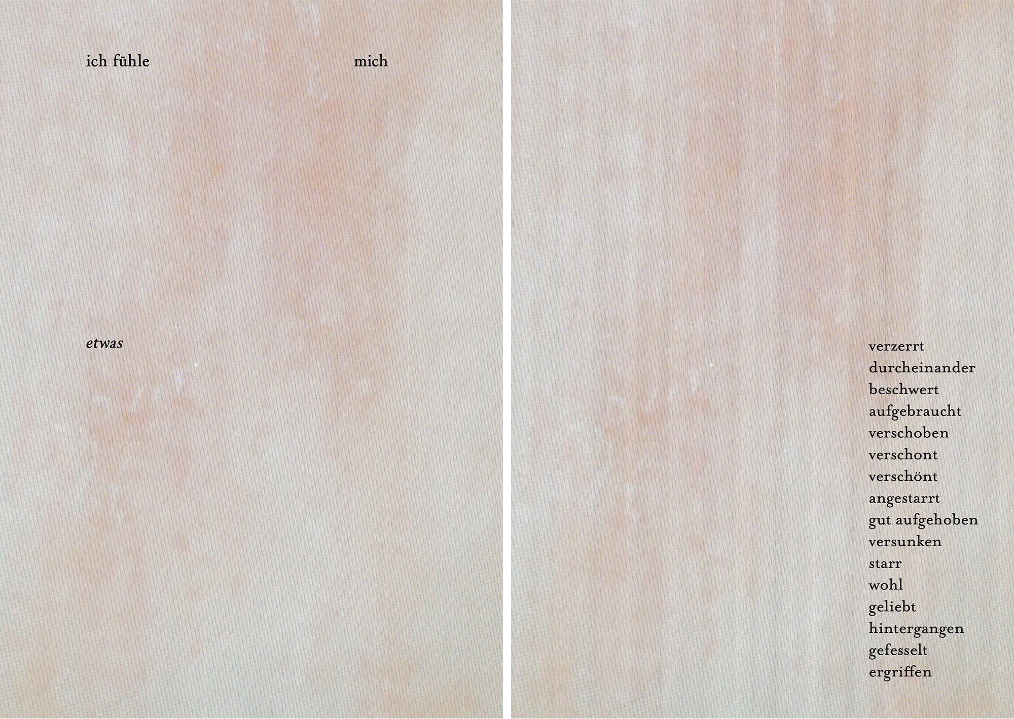 ich fühle mich etwas (2022) — Our skin is sensitive to the way we feel. In the series »ich fühle mich etwas« (I feel me, I feel something), microscope photographs of the skin demonstrate how it makes emotions visible and how sensitively our skin reacts to social encounters when moments get close. Skin textures in these photographs are overlaid with external display and material structures that inhibit a clear view of the skin. The work includes fabric prints, sculptures and a poetry booklet, all of which interact sensitively with environment and people.